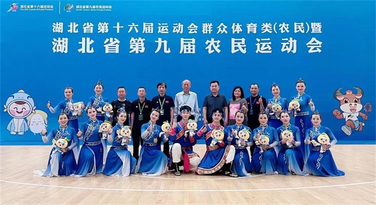 熱烈祝賀謝芳同志(照片中第一排從左到右第三位)在湖北省第十六屆運(yùn)動(dòng)會(huì)群眾類(農(nóng)民)健身操團(tuán)體比賽中獲得一枚金牌,四枚銀牌,團(tuán)體總分第一的優(yōu)異成績(jī)。